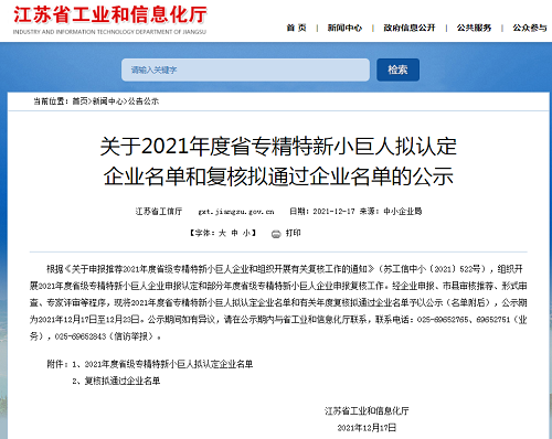 12月17日,江苏省工业和信息化厅对2021年度省专精特新小巨人拟认定企业名单和复核拟通过企业名单进行公示,常州海图科技凭借稳步的技术创新能力和非凡的市场表现成功入围拟认定企业名单。
