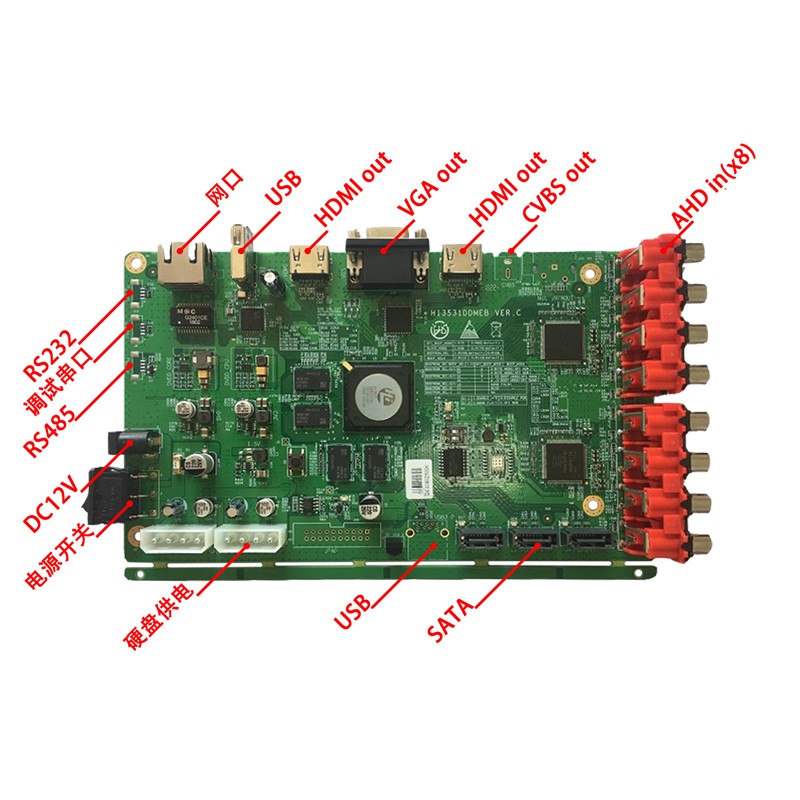Hi3531DV100标准开发板提供8路AHD模拟高清输入、8路音频输入、HDMI口输出、USB3.0、USB2.0、SATA、10M/100M/1000网络、RS232、RS485、GPIO等丰富外围接口。