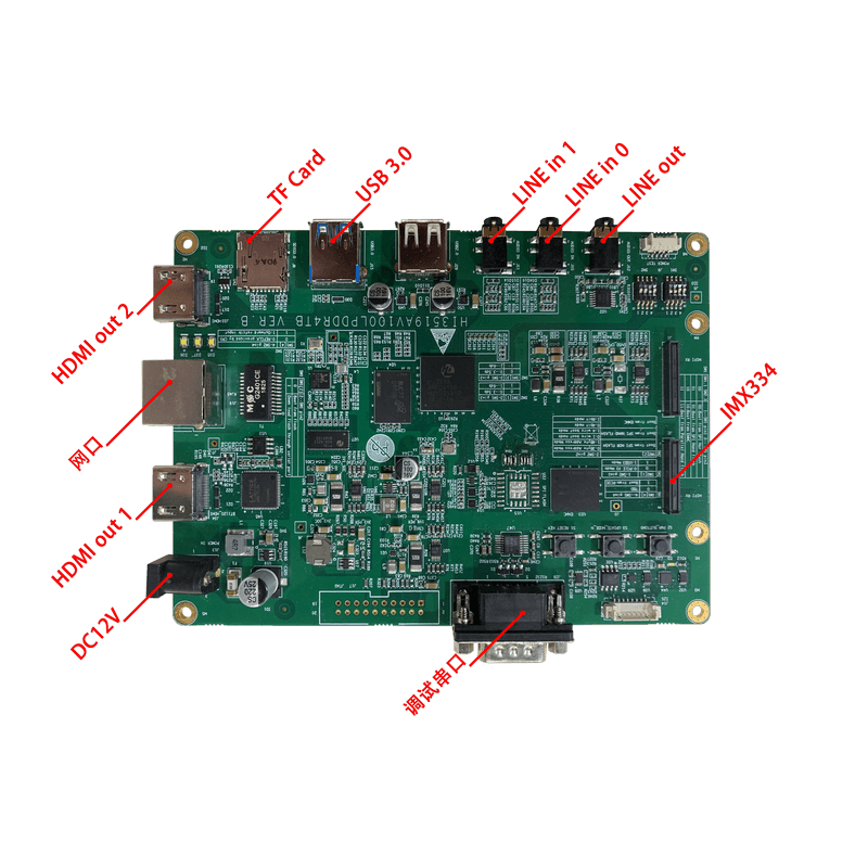 Hi3519AV100标准开发板标配为索尼IMX334镜头模组输入、4K@30 HDMI输出、USB3.0、SDIO3.0、1路10M/100M/1000网络、RS232、RS485、GPIO、RTC等丰富外围接口。